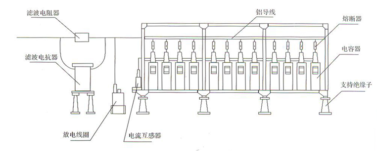 本裝置由濾波電容器組、空芯電抗器、開關(guān)(隔離開關(guān)、接地開關(guān)、斷路器等)、避雷器、熔斷器、電流互感器、放電線圈、電阻器及絕緣子、框架等組成。(裝置中根據(jù)用戶要求電器元件有所增減,均符合相應(yīng)的標(biāo)準(zhǔn))